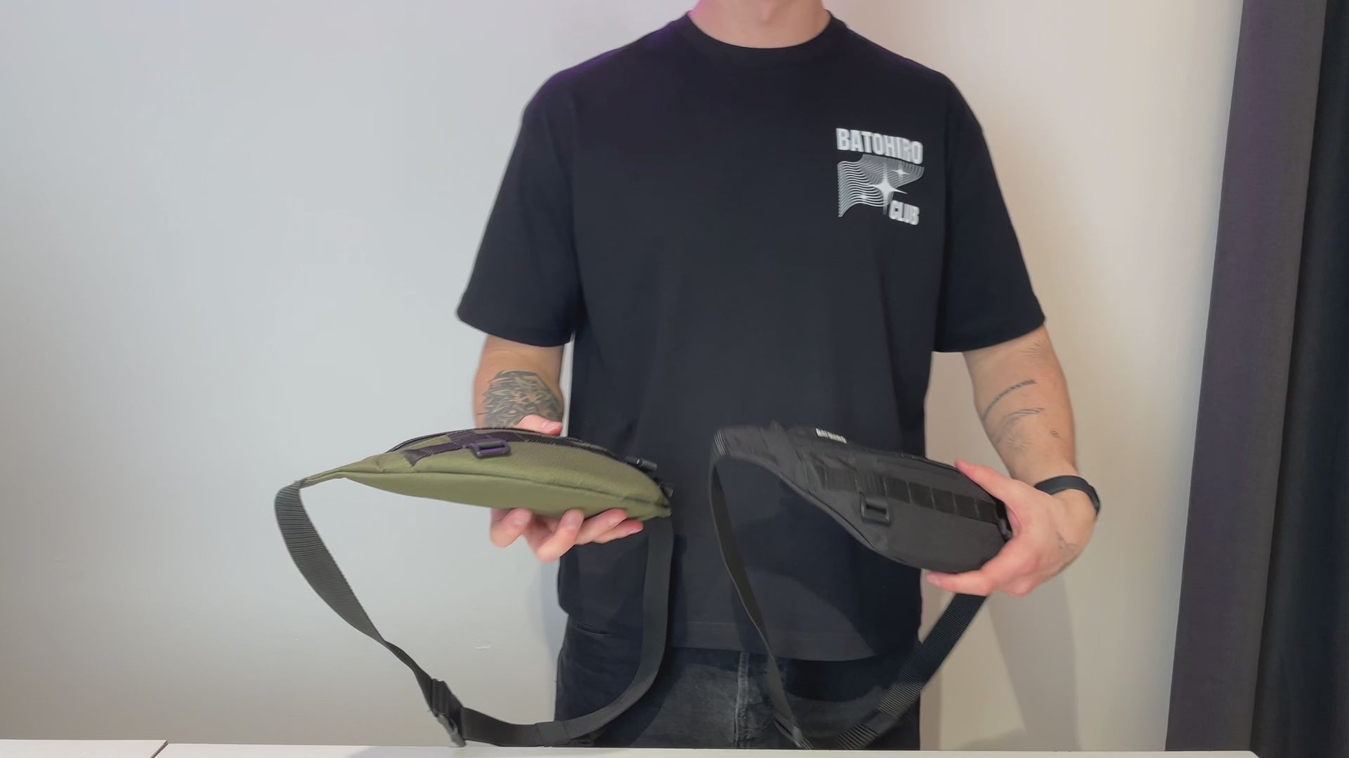 Model wearing a cropped oversized T-shirt with Batohiro branding from the back, showcasing its modern design.Man wearing a cropped oversized t-shirt with Batohiro design, showcasing a stylish back view.